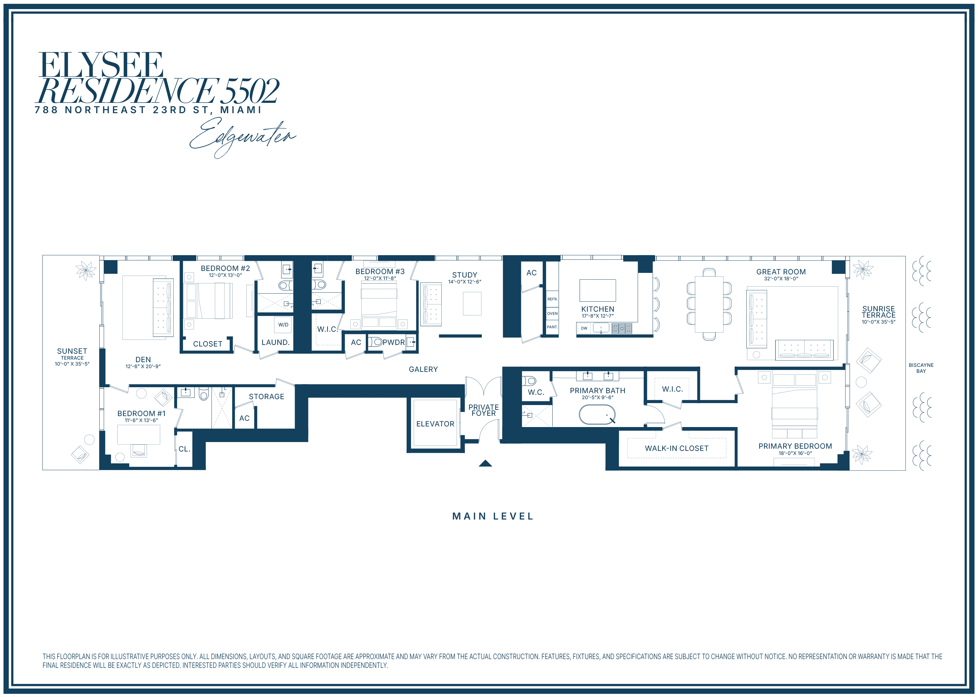 Building amenities include sunrise and sunset pools, a state-of-the-art fitness center, a private owner’s lounge on the 30th floor, a children’s playroom, valet service, and 24-hour concierge. Offering privacy, generous living space, and full-service amenities, this residence is ideally positioned in one of Edgewater’s premier waterfront buildings.